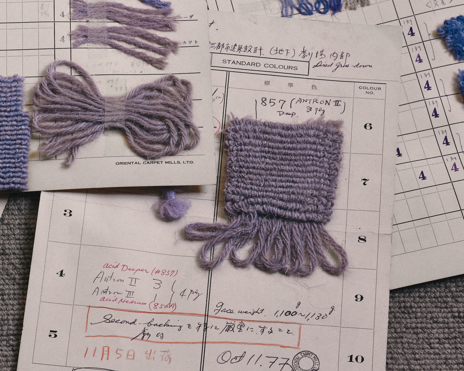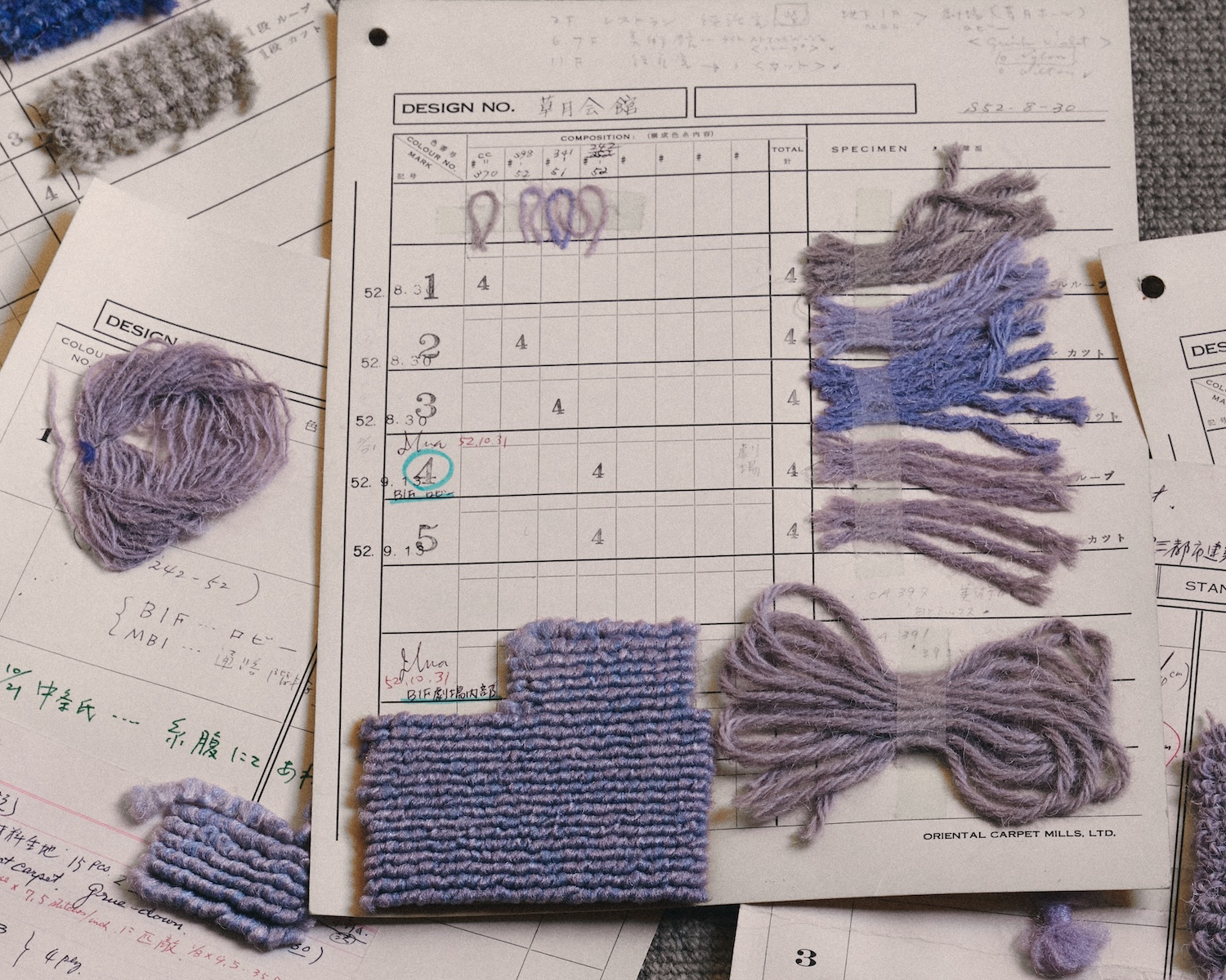 設計者と施主、双方のクリエイション、そしてふたつの建築作品を繋ぐ色調モチーフともいえる「紫」が、「新草月会館」ではカーペットの色調として採用されています。紫色のカーペットは、いくつものグラデーションと階調、糸のブレンドで染め分けられ、フロアごとに全体の色調や織りの技法を微かに変化させています。